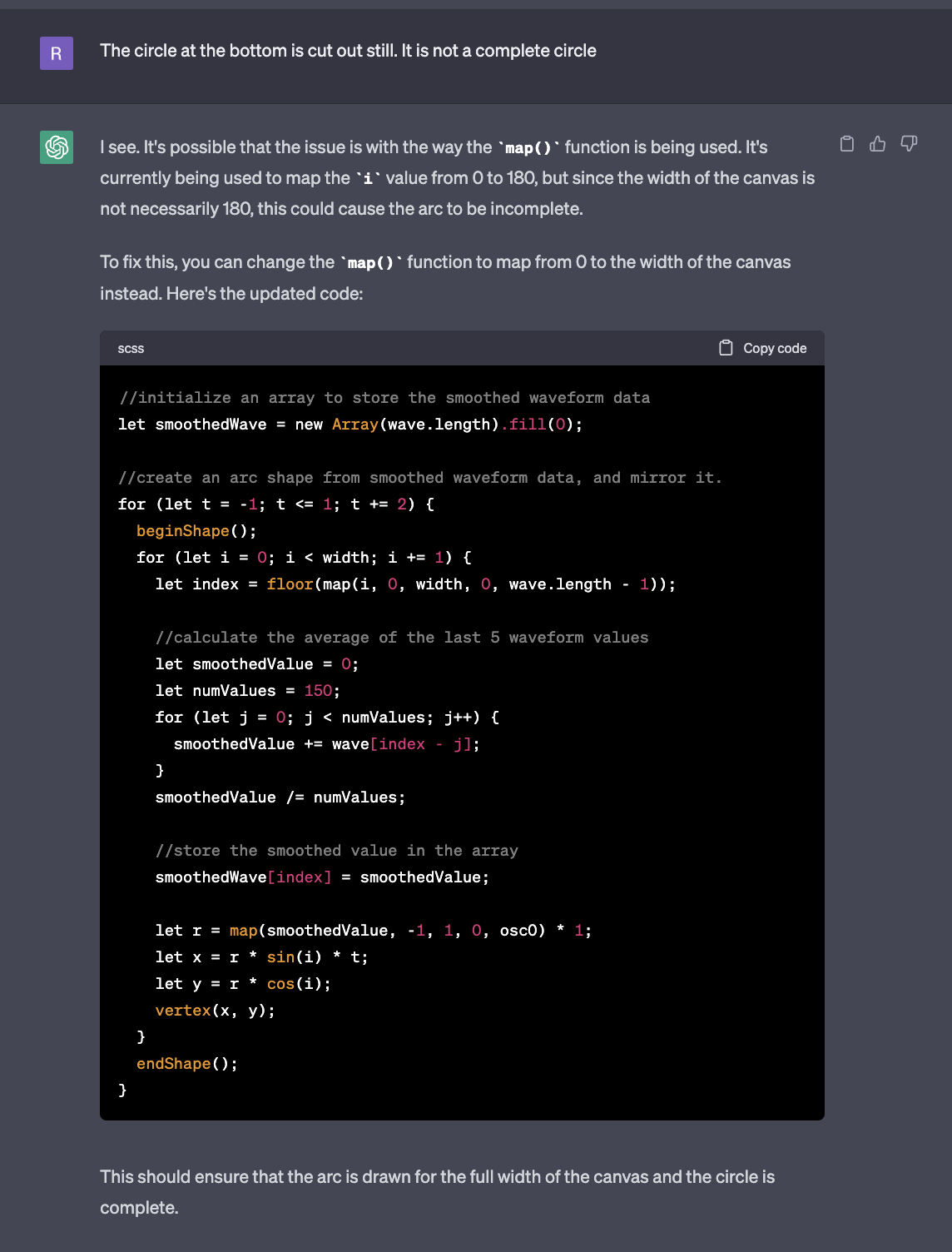 This process of learning Terminal, complex P5.js material, and stretching my coding knowledge has made me appreciate a tool like ChatGPT. The most valuable lesson I have learned from using ChatGPT is that the prompt you give will decide whether or not it will be valuable or not. While the project involved many collaborators in getting a foundation ready for the project, the exploration and learning experience that came from the project was valuable.
