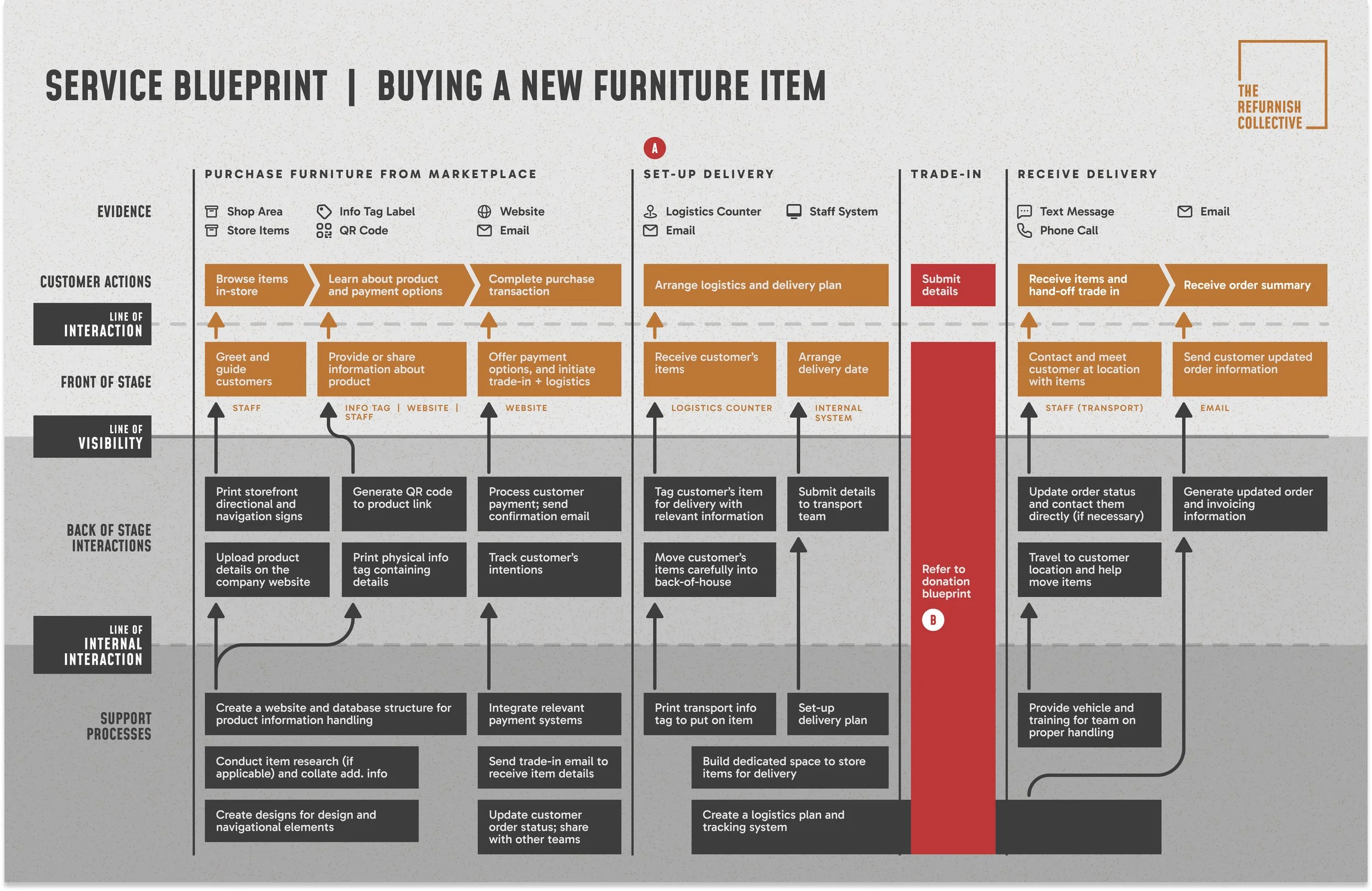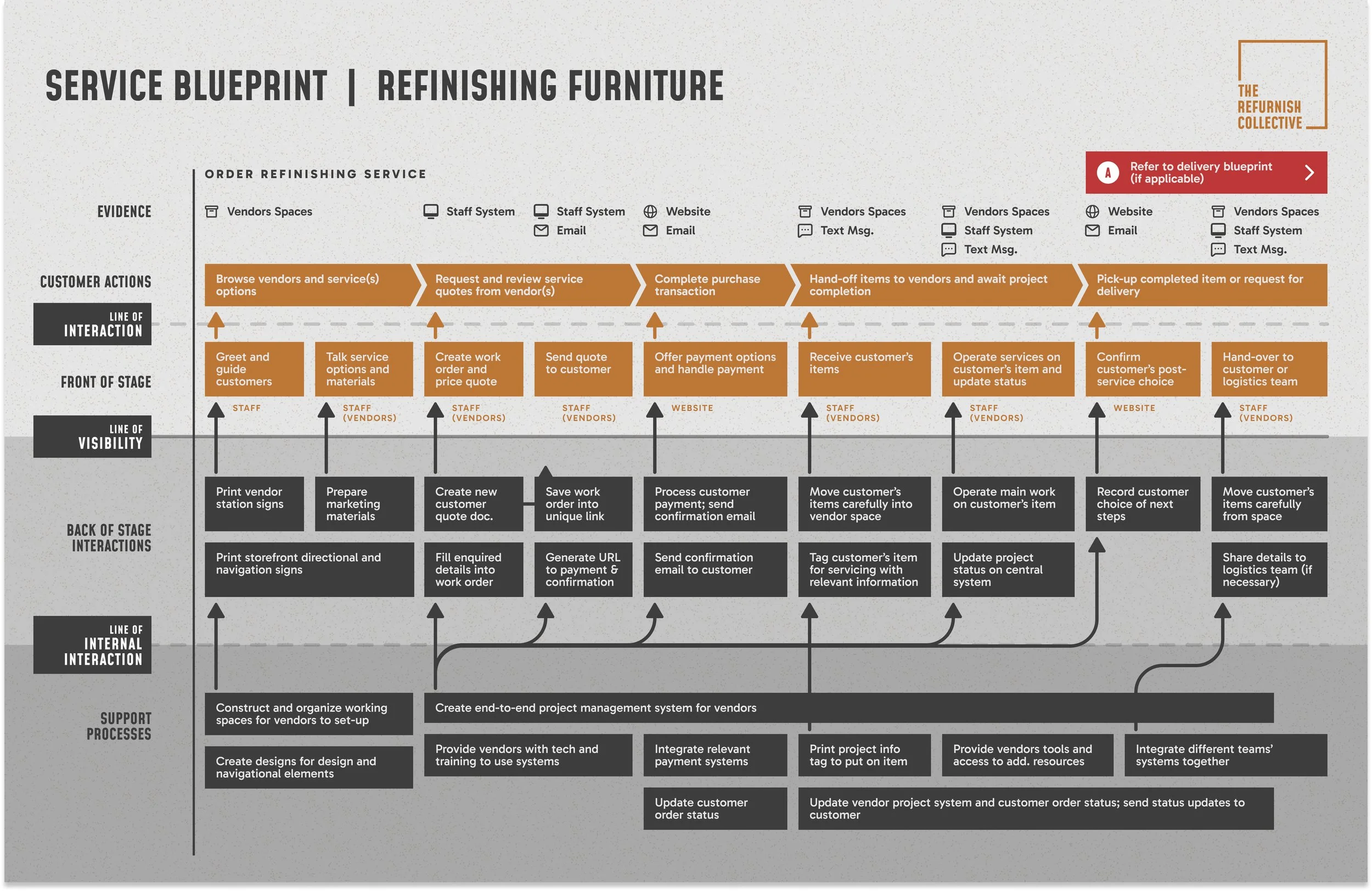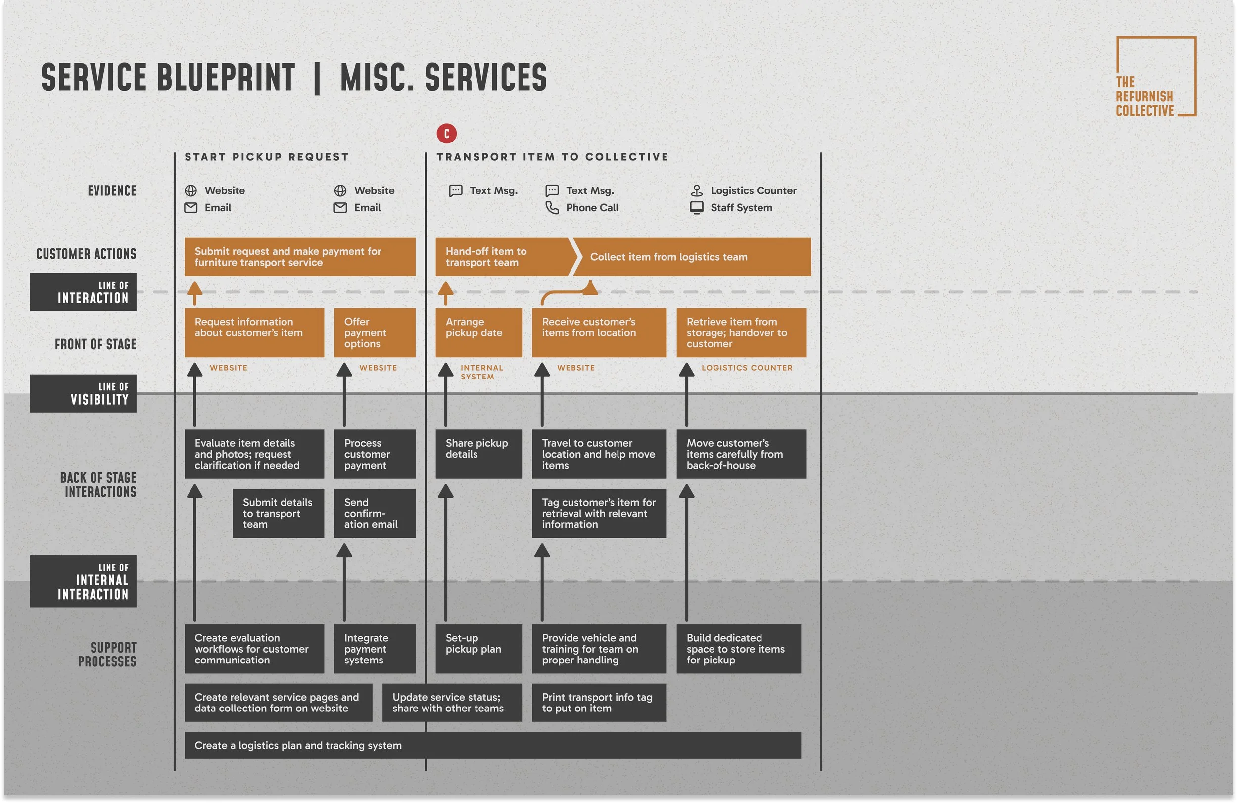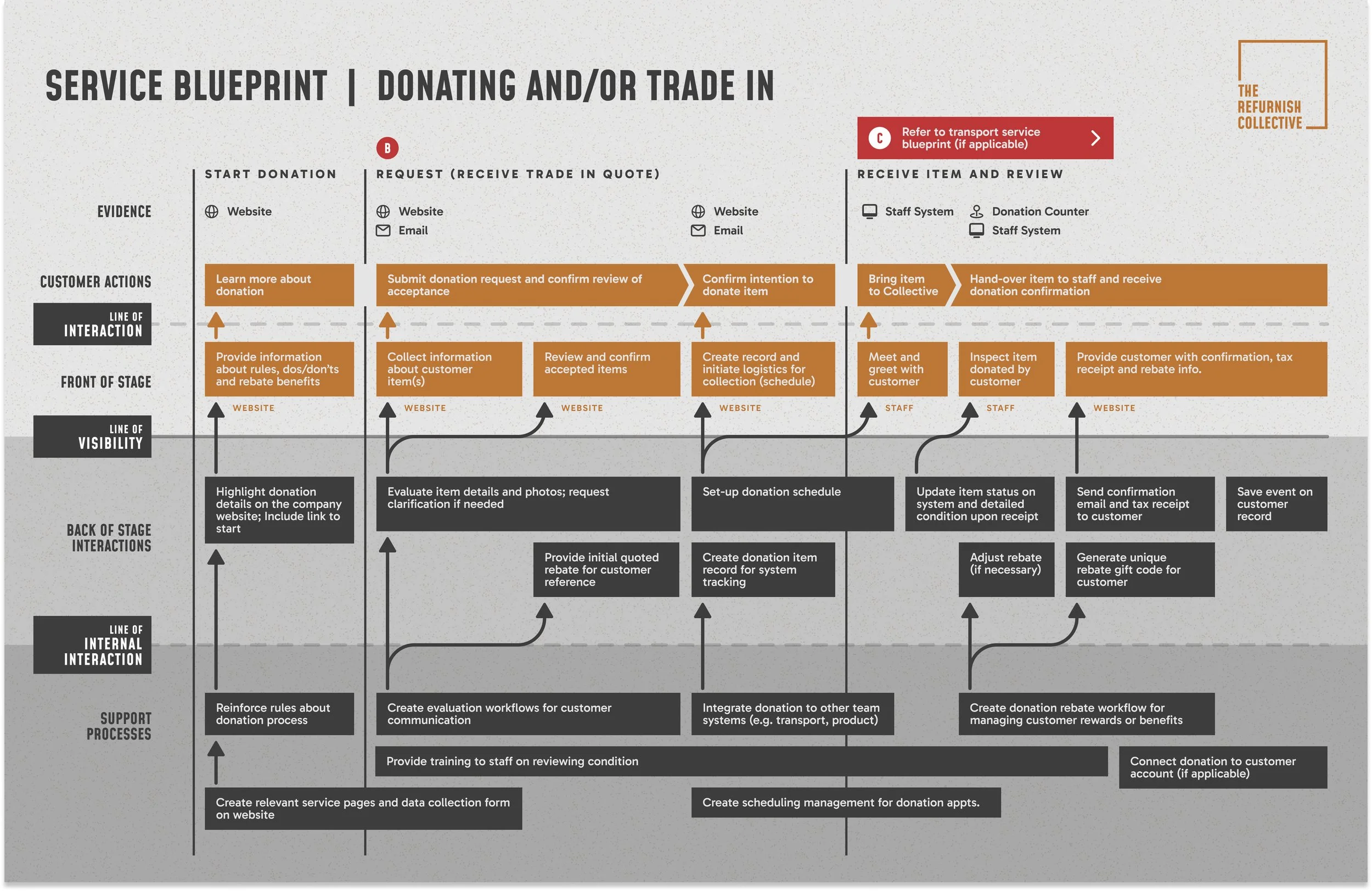 This service blueprint highlights how the service will work, the touchpoints, and process flows.