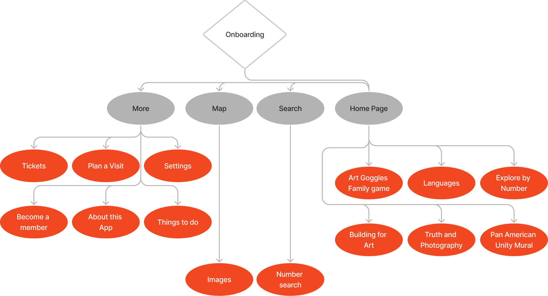 The old SFMOMA application's site map often led to confusing navigation and hindered users from easily finding their way. The previous version presented numerous options and appeared to immerse users in their phones rather than aiding their search for specific artworks. In contrast, the new map feature takes center stage, prioritizing straightforward navigation. While it still maintains the search for artwork function and audio listening tours, these features are integrated within the map interface.