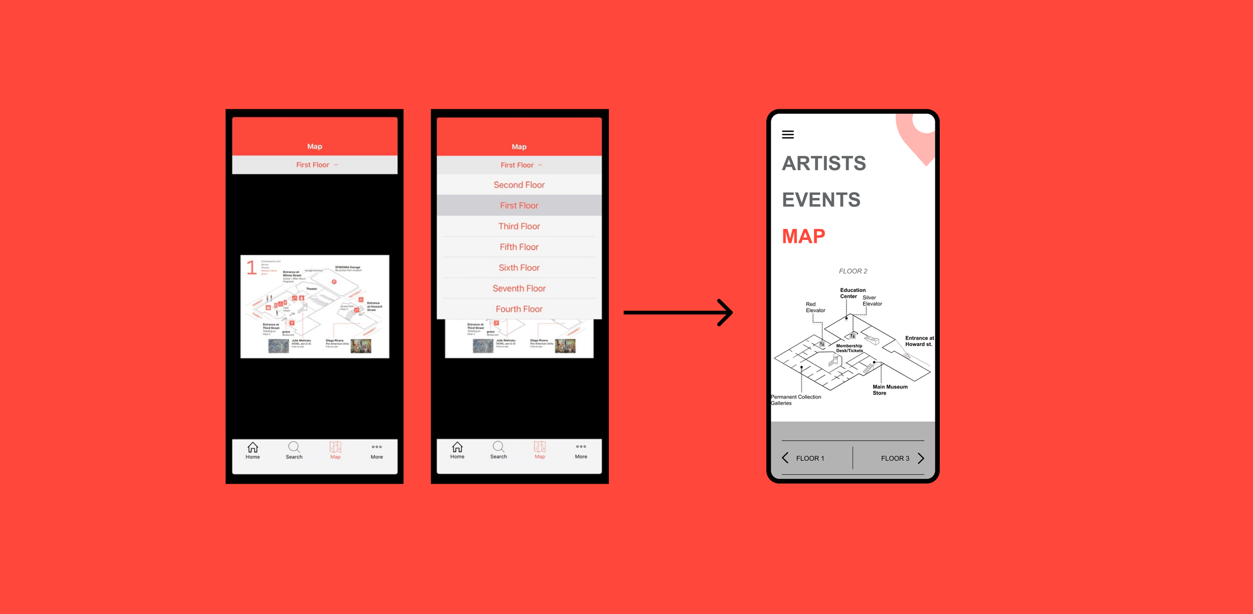 The SF MOMA redesign project started because of an unclear map experience on the existing application. With the previous app being a touch point of the museum users need to find their way around the museum. Using the redesign, museum attendees will be able to see busy locations and navigate their experience at the museum with ease.